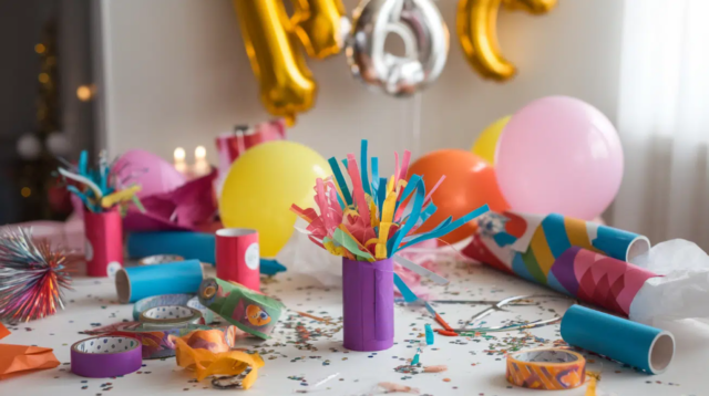 Vaja läheb tühje tualettpaberi rulle, õhupalle, teipi, kääre ning värvilist siidipaberit või konfette. Lase lastel rullid enne täitmist markerite, kleepsude või kinkepaberiga kaunistada.